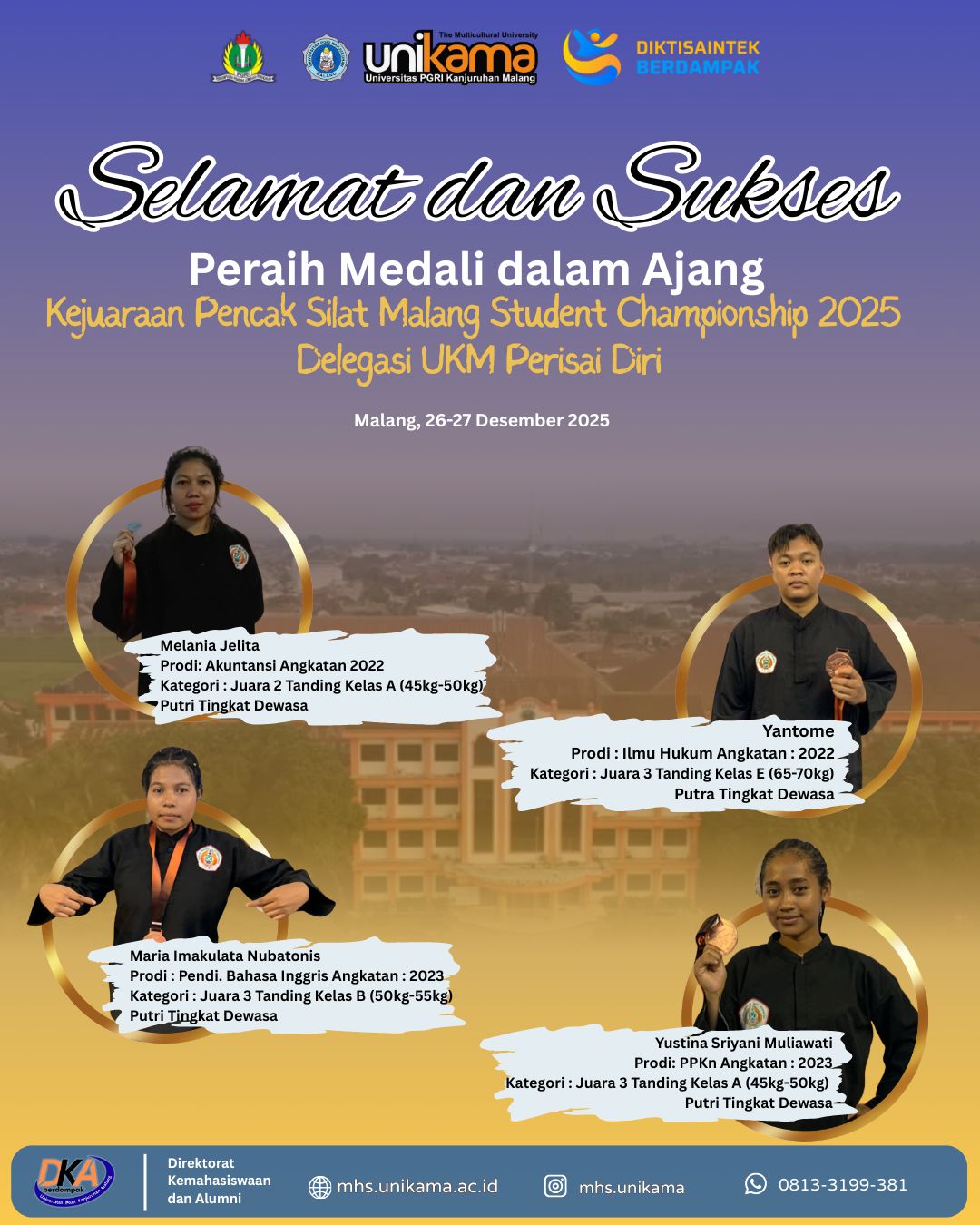 Mahasiswa Universitas PGRI Kanjuruhan Malang (Unikama) kembali mengharumkan nama kampus melalui ajang Kejuaraan Pencak Silat Malang Student Championship 2025. Delegasi dari UKM Perisai Diri Unikama berhasil meraih sejumlah prestasi membanggakan pada kategori tanding tingkat dewasa.
