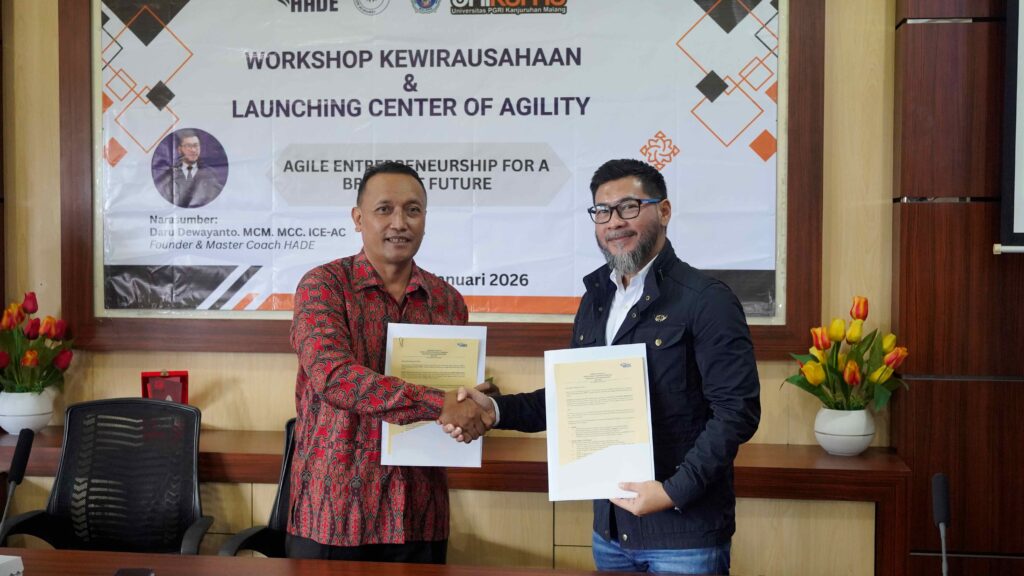 Dalam rangkaian kegiatan tersebut, juga dilaksanakan penandatanganan Nota Kesepahaman (MoU) antara Direktorat Kemahasiswaan dan Alumni Unikama yang diwakili oleh Dr. Teguh Sulistyo, M.Pd., dengan HADE yang diwakili oleh Daru Dewayanto, MCM, MCC, ICE-ACE. Kerja sama ini bertujuan memperkuat sinergi dalam pengembangan kewirausahaan berbasis agile, termasuk pendampingan, pelatihan, serta penguatan kapasitas sumber daya manusia di lingkungan kampus.
